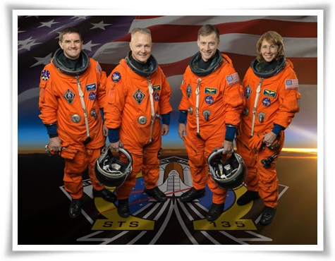 Załoga misji STS-135: Christopher Ferguson (3) - dowódca, Douglas Hurley (2) - pilot, Sandra Magnus (3) - specjalista misji, Rex Walheim (3) - specjalista misji