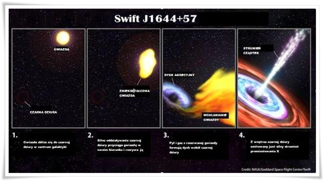 Każda galaktyka, a więc także i nasza, posiada w swoim sercu czarna dziurę, wielokrotnie przewyższającą swą masą masę gwiazdy centralnej. Gdy gwiazda zaczyna się zbliżać do czarnej dziury, ta oddziałuje na nią z potężną siłą i rozrywa. Wyrzucana jest ogromna ilość gazów, które podgrzewają się do milionów stopni Celsjusza. Magnetyzm czarnej dziury jest tak silny, że wkrótce do jej czeluści zostają wciągnięte nie tylko pozostałości gwiazdy ale i światło wcześniej przez nią emitowane. Astronom Andrew Levan z brytyjskiego uniwersytetu Warwick, zapytany czy do tego rodzaju zjawiska mogłoby dojść w naszym sąsiedztwie w Drodze Mlecznej, odpowiedział, że teoretycznie tak, ale prawdopodobieństwo jest bardzo małe.
