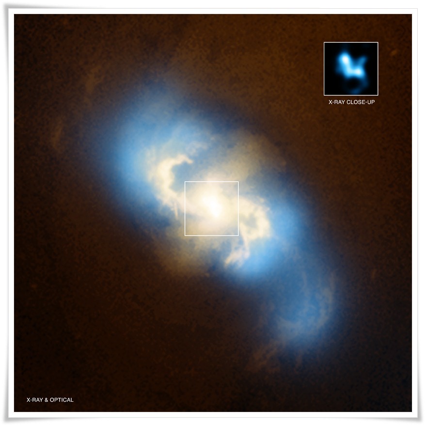 Tym paniom nadwaga służy. Unikalna para super masywnych czarnych dziur w galaktyce NGC 3393 - Zdjęcie stanowi nałożenie obrazów rentgenowskiego (kolor niebieski) i optycznego (kolor złoty). W kwadracie pokazano rentgenowski obraz pary supermasywnych czarnych dziur w centrum galaktyki. Źródło: zdjęcie rentgenowskie: NASA/CXC/SAO/G.Fabbiano et al; zdjęcie optyczne: NASA/STScI.Spełniło się marzenie astrofizyków. I to już chyba nie raz, ale tym razem jest to wyjątkowe marzenie. Marznie związane z parą czarnych dziur, które dadzą im nowe możliwości badania Wszechświata i sprawdzania ich nieziemskich teorii.