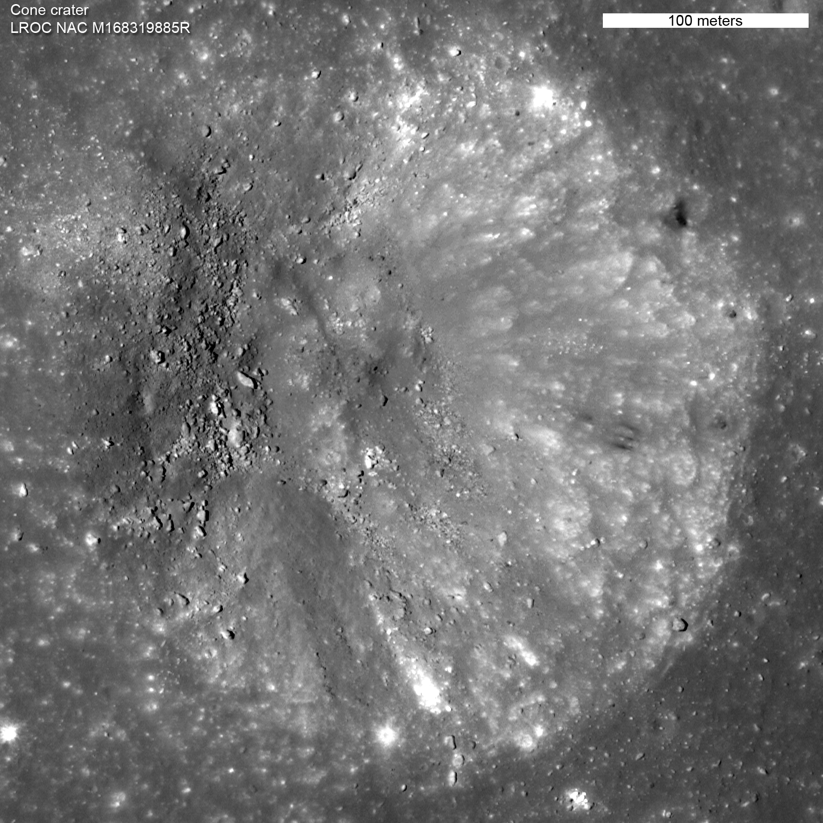 Apollo 14 - LROC NAC low orbit image of Cone crater, near the Apollo 14 landing site. Image is 400 meters wide, north is up, Sun is from the west (left) [NASA/GSFC/Arizona State University].Apollo 12Apollo 14 - Saddle rock, so close! Apollo 14 astronauts hiked up the flanks of Cone crater and got as far as Saddle rock before they had to turn back. A few tens of meters and what a view! LROC image 25 cm pixel scale, image 200 meters wide, north is up [NASA/GSFC/Arizona State University].Miejsce lądowania Apollo14Miejsce lądowania Apollo 17
