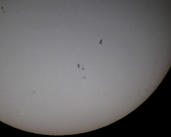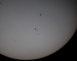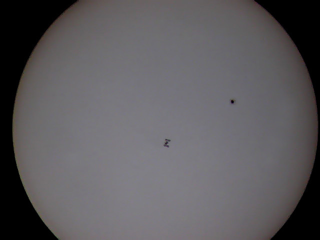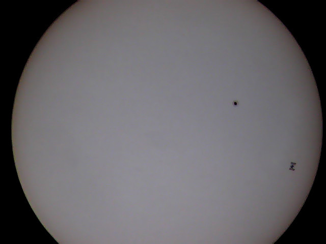Czas przelotu ISS przez tarczę zależy od kąta pod jakim obserwujemy zjawisko. I tak jeśli mamy około południa przelot będzie bardzo szybki( poniżej 1s), a Stacja będzie stosunkowo dużym obiektem na tle tarczy Słońca, jeśli obserwacje prowadzimy np. o godz. 17stej Słońce jest już niżej nad horyzontem, Stacja przeleci wolniej, ale będzie niewielkim punktem przesuwającym się po tarczy ok 3s Aby uwiecznić taki przelot na filmie wybieram metodę najprostszą z możliwych czyli projekcję afokalną. Za pomocą prostego adaptera mocuję aparat cyfrowy do okularu teleskopu i włączam nagrywanie ok 2 minut przed przewidywanym przelotem (tak na wszelki wypadek gdyby się okazało ze obliczenia nie są zbyt precyzyjne lub mój zegarek chodzi jak mu się podoba). Teraz wystarczy poczekać na sam przelot i filmik z przelotu Międzynarodowej Stacji Kosmicznej na tle Słońca gotowy.
