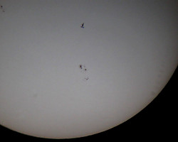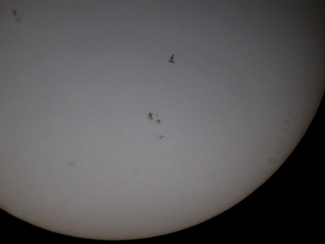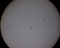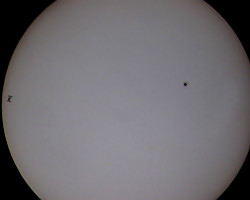 Tak jak Stacja w ciągu nocy przelatuje na tle gwiazd, tak w dzień zdarza się że przeleci na tle tarczy Słońca. Dla tych, którzy przygodę z astronomią dopiero zaczynają, chciałbym przedstawić sposób jak zaobserwować i zarejestrować przelot ISS na tle Słońca. Nie trzeba do tego wyspecjalizowanego drogiego sprzętu. Osobiście używam teleskopu TAŁ 100RS, jest to rosyjski refraktor o średnicy soczewki głównej 100mm i ogniskowej 1000mm. Na montażu azymutalnym z prowadzeniem ręcznym i aparatu cyfrowego Canon A580, ale równie dobrze można posłużyć się lornetką z filtrami na okularach.