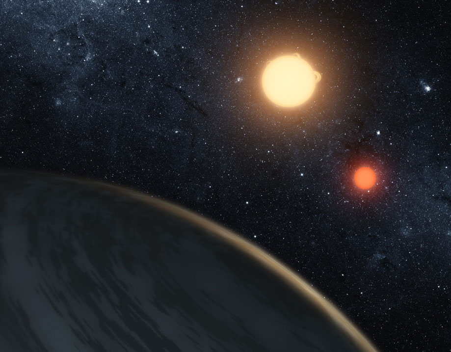 NASA's Kepler mission has discovered a world where two suns set over the horizon instead of just one. The planet, called Kepler-16b, is the most "Tatooine-like" planet yet found in our galaxy and is depicted here in this artist's concept with its two stars. Tatooine is the name of Luke Skywalker's home world in the science fiction movie Star Wars. In this case, the planet it not thought to be habitable. It is a cold world, with a gaseous surface, but like Tatooine, it circles two stars. The largest of the two stars, a K dwarf, is about 69 percent the mass of our sun, and the smallest, a red dwarf, is about 20 percent the sun's mass.