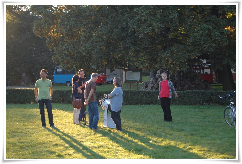 Od 20:15 byliśmy gotowi przy harcerskim ognisku do obserwacji Jowisza. Wspinał się on mozolnie między drzewami parku pałacowego. Im był wyżej, tym jakość obrazu była lepsza. W końcu po 21:20 można było dostrzec szczegóły w atmosferze w tym Wielką Czerwoną Plamę. Już po godzinie obserwacji widać było przemieszczenie plamy wynikłe z rotacji Jowisza. Skrupulatni obserwatorzy zauważyli też ruch księżyców. Był on znacznie subtelniejszy, ale dostrzegalny. O 22:00 obserwacje zakończyła mgła z pobliskiej rzeki. Tak to jest mieszkać nad wodą, gdy wieczory staja się chłodniejsze od pięknego jesiennego dnia.