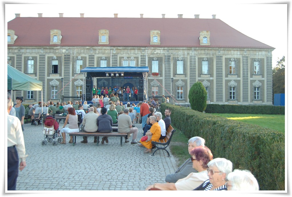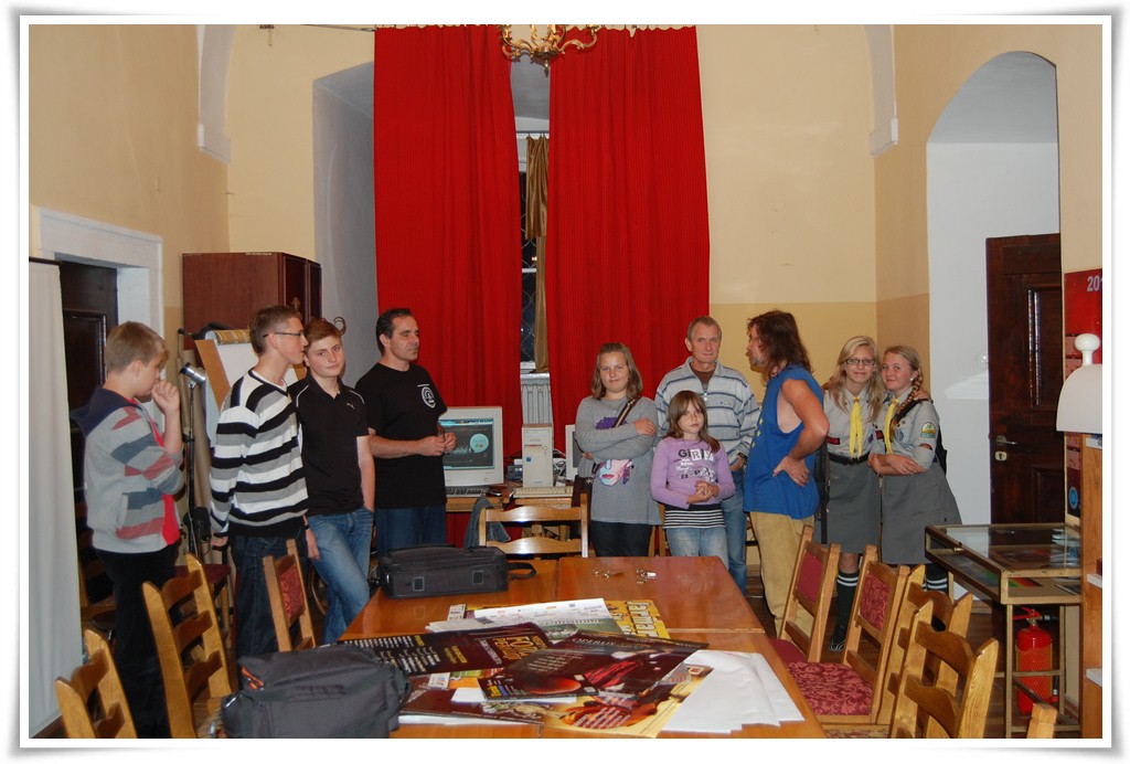 Obserwacje Słońca na przed Żagańskim Pałacem KsiążęcymTym razem w ramach ich imprezy zorganizowaliśmy pokazy Słońca. Na scenie występował harcerski zespół pięknie śpiewając, a obok sceny my ustawiliśmy nasz teleskop skierowany na naszą gwiazdę. Tarcza usiana plamami stale wzbudza zaciekawienie. Można też było zbudować dla siebie zegar słoneczny w oparciu o naszego „kolosa” który w taką pogodę regularnie odmierza czas słoneczny. Gotowe szablony rozdawaliśmy chętnym, a przy okazji mogli oni wszyscy poznać jak działa taki zegar.