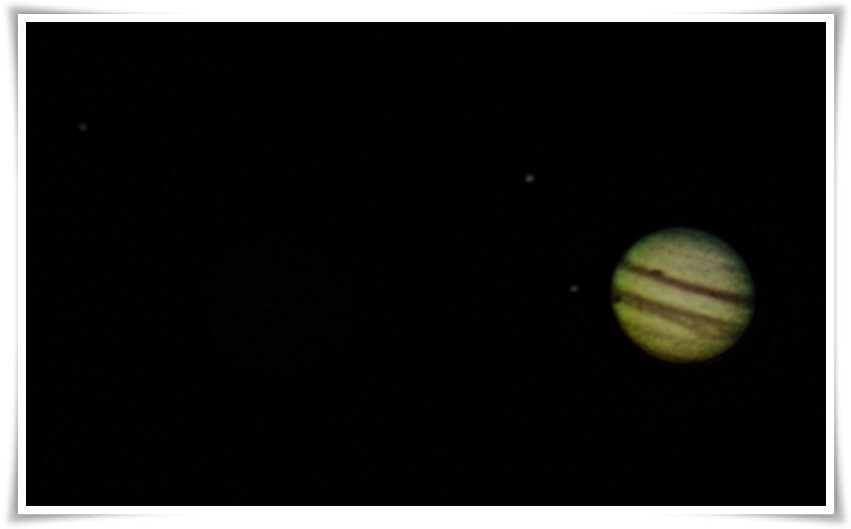 Autor: Mariusz Rudziński. To zdjęcie wykonałem 29-09-2011 ok godz 22:01. Seeing był notabene tragiczny wszystko się rozmazywało i falowało jak w wodzie. Dlatego tylko jedno zdjęcie z początkowej fazy przejścia cienia Io wyszło na tyle że można je komukolwiek pokazać. Widzimy tu od lewej: Europę, Ganimedesa, Io i jego cień na brzegu tarczy Jowisza i oczywiście sam Jowisz w roli głównej. Metoda jak zwykle ta sama: Teleskop Tał 100RS z prowadzeniem ręcznym cyfrówka Canon A580 podczepiona za pomocą adaptera do okularu 8 mm i 20 sekundowe filmowanie całej sytuacji. Filmik w formacie AVI wrzucam do Ragistaxa 2 trochę zabawy krzywymi i delikatna obróbka w programie graficznym i mamy zdjęcie Io rzucającego cień na Jowisza. Pewnie ze jakość byłaby lepsza gdyby to wszystko zrobić za pomocą kamery CCD i teleskopu z prowadzeniem automatycznym ale liczy się zabawa i efekt swojej pracy