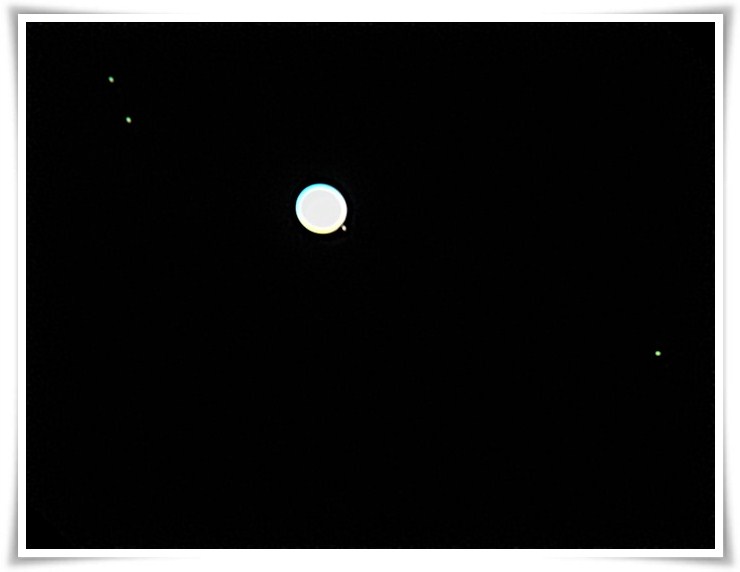 Godz. 23:10 wystawiamy teleskop. Pokazuje synowi jak orientuje się teleskop na gwiazdę polarną, zakładam okular 24mm i już możemy zobaczyć Jowisza i jego cztery największe księżyce. 23:30, Io wydaje się być już bardzo blisko tarczy