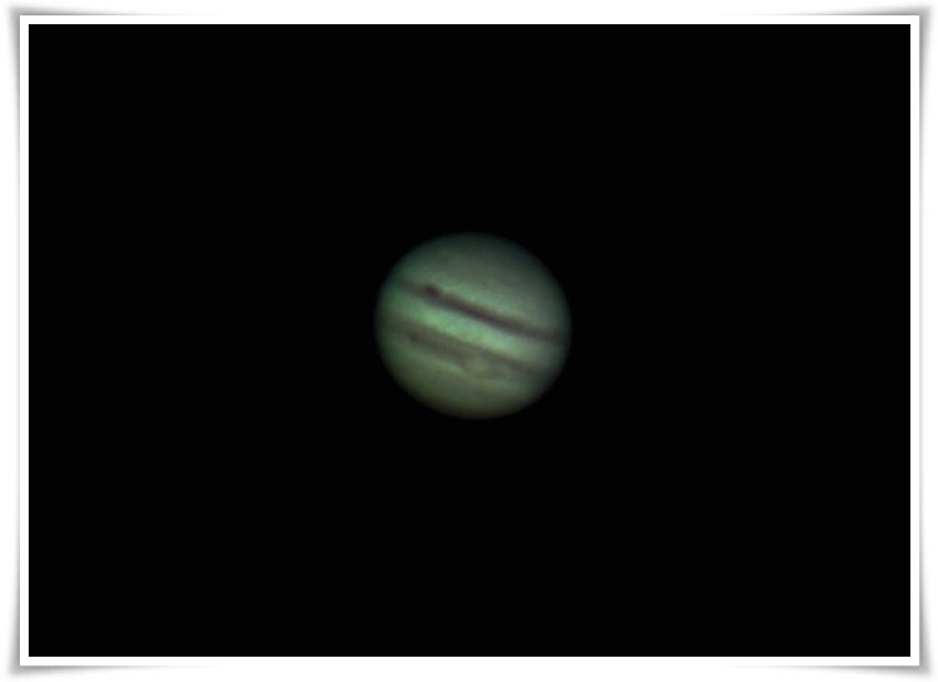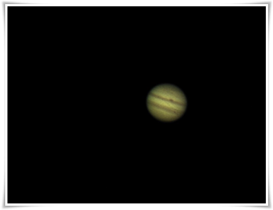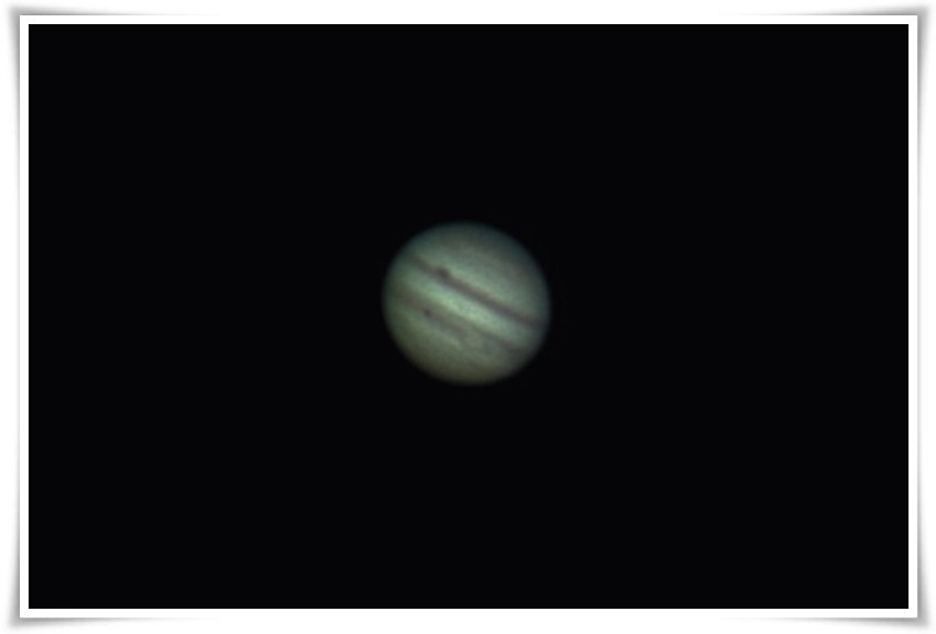 Godz. 01:53 Księżyc Io dociera do drugiego brzegu tarczy. Widać go na zdjęciu jako maleńką kropeczkę wystającą z tarczy Jowisza. To była wspaniała noc.