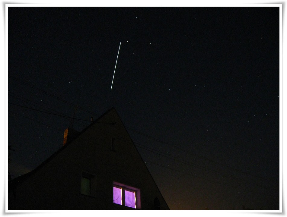 18:50 stacja wyłania się zza horyzontu, ustawiam na nią szukacz i po chwili mam ją w okularze! Pięknie widać panele słoneczne ale blask odbitego światła jest bardzo silny. Następnym razem spróbuje zastosować filtr księżycowy, może wtedy uda się zobaczyć więcej szczegółów. Udaje mi się stację śledzić prawie do zenitu. W tej pozycji ciężko już patrzeć w okular;) ISS przelatuje nad moim domem