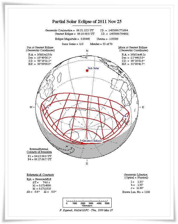 Mapka przedstawiająca obszar, na którym 25 listopada 2011 widoczne będzie częściowe zaćmienie Słońca. Obejmuje on prawie całą Antarktydę, południowy skrawek Afryki i większość Nowej Zelandii. Maksymalna faza zjawiska (około 90 procent) nastąpi o 7:20 w pobliżu wybrzeży zachodniej Antarktydy.