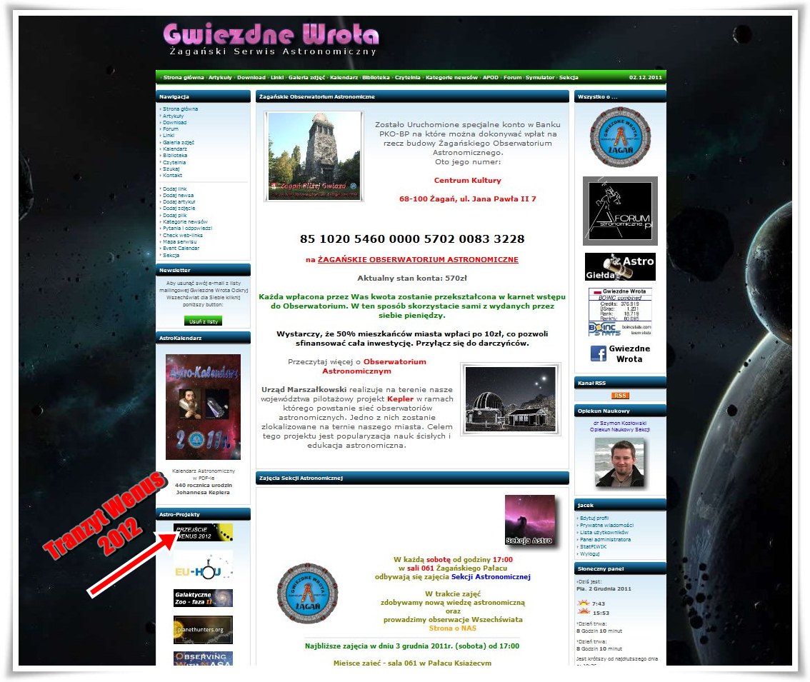 Na naszej stronie znjduje się łącze do specjalnego serwisu przygotowane przez organizatorów VT-2012. Miejsce wskazane strzałka zaprowadzi Cie do niego za każdym razem.W roku 2012 będziemy mieli niezwykłą okazję obserwować tranzyt Wenus na tle tarczy Słońca. Następne takie zjawisko nastąpi 11 grudnia 2117 roku. W związku tak wyjątkowym wydarzeniem uruchomiony został projekt pod nazwą VT-2012.