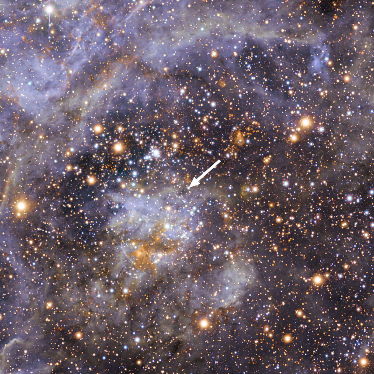 Najszybciej rotująca gwiazda. Fragment Mgławicy Tarantula w Wielkim Obłoku Magellana sfotografowany za pomocą 2,2-metrowego teleskopu MPG/ESO i 4,1-metrowego VISTA. Strzałką zaznaczono gwiazdę VFTS 102. Źródło: ESO/M.-R. Cioni/VISTA Magellanic Cloud survey. Acknowledgment: Cambridge Astronomical Survey UnitW celu uzyskania obrazu układu podwójnego wykonano obserwacje za pomocą Interferometru Bardzo Dużego Teleskopu (VLTI). Światło z kilku teleskopów obserwujących ten sam obiekt umożliwiło powstanie wirtualnego teleskopu odpowiadającemu instrumentowi o średnicy aż 130 metrów. Uzyskany obraz jest 50 razy ostrzejszy niż zdjęcia z Kosmicznego Teleskopu Hubble'a (HST) - rozdzielczość HST to około 50 milisekund łuku, a rozdzielczość wirtualnego teleskopu VLTI osiąga 1 milisekundę łuku. To tak jakby z powierzchni Ziemi dostrzec astronautę znajdującego się na Księżycu.