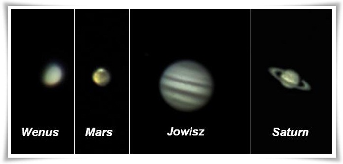 Kompozycja zdjęć czterech planet wykonano w styczniu 2012r.Nasz kolega, Mariusz Rudziński, przesłał nam swoje pierwsze wrażenia tego roku z nocnych wypadów na polowania astrofotograficzne. Choć pogoda tak samo wszystkim nie dopisuje, to dzięki swojemu uporowi udało mu się pokazać na swoich zdjęciach całą planetarną menażerię dostępną nad naszymi głowami w styczniu tego roku. Warto nadmienić, że ma on już spore doświadczenie w polowaniu na planety naszego układu i nie raz pokazał czytelnikom swoje niezwykłe osiągnięcia w tym zakresie. Zobaczmy więc co ciekawego udało mu się dla nas upolować.