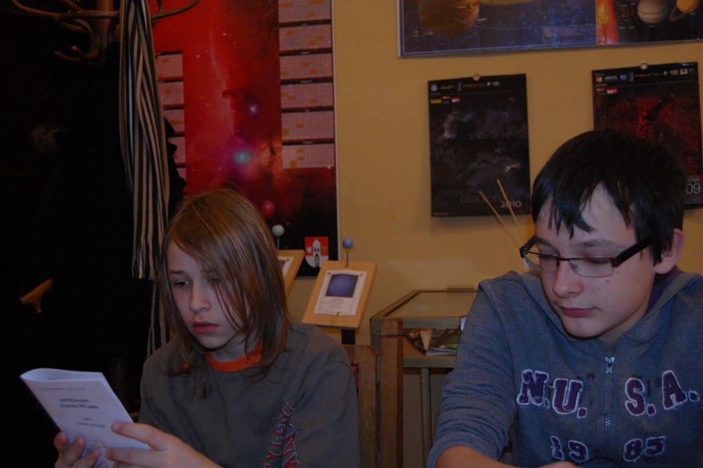 Astronomia Ogólna cz.1 Pana Wilanda w rękach KarolaSława dawnej piosenki są sposobem na zmianę nastroju w tak niepogodny dzień jaki nam ostatnio przyszło spędzić. Bo jeden wieczór z niebem usianym gwiazdami zmieni wszystko przez cały kolejny tydzień. Pogoda nie łaskawa dlatego spotykamy się w naszej Sali by czynić kolejne kroki w naszym projekcie. A pracy jest jeszcze sporo i nauki nie mało. Pomoże nam w tym podręcznik napisany przez Pana Janusza Wilanda. Wieloletni pasjonat astronomii, który dobrze wie jak trudno jest amatorom nieba dotrzeć do wiedzy przygotowanej na ich poziomie poznania. Przygotował on niewielką broszurę która zawiera niezbędne wiadomości z astronomii. To pozwoli poznać tyle by dalej iść już w poważniejszym towarzystwie literatury fachowej. Każdy dostał do ręki na własność wydanie tej pozycji, które wydrukowaliśmy i oprawiliśmy już sami. Za tą pomoc dziękujemy Panu Januszowi.
