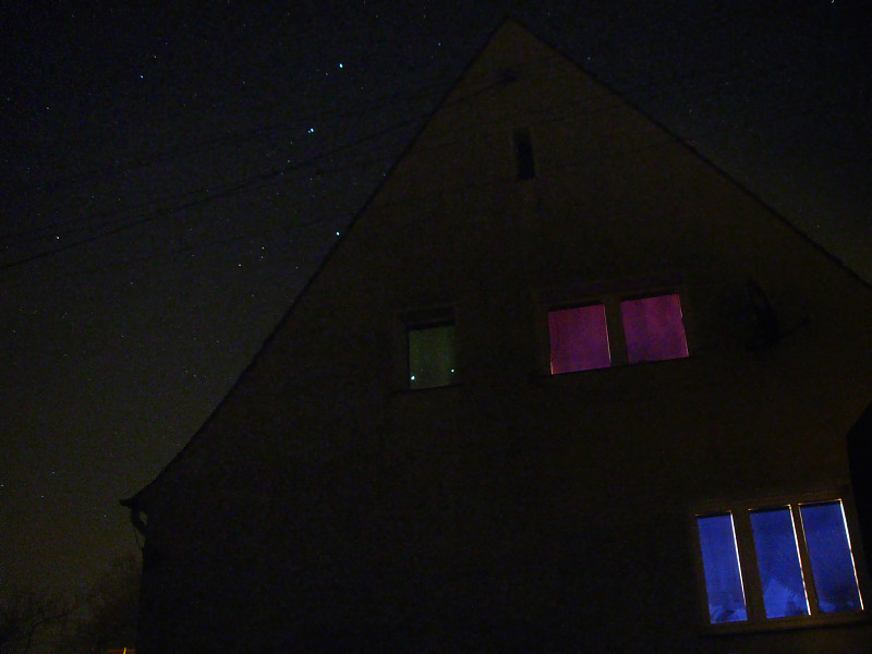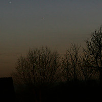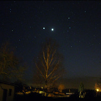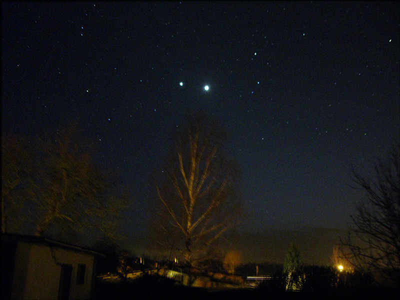 Po rzuceniu okiem przez teleskop na Wenus i Jowisza, postanowiłem uwiecznić dzisiejsze maksymalne zbliżenie obu planet. Jeszcze jutro może tez by się to udało ale prognozy mówią o całkowitym zachmurzeniu wiec nie było na co czekać tylko trzeba strzelać foty dzisiaj:) Oprócz standardowego zdjęcia tej pięknej koniunkcji, utrwaliłem na zdjęciu jak obie planety odbijają się w oknie mojego domu :)
