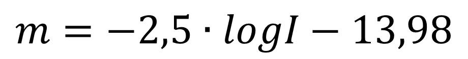 Podsumowując dwie gwiazdy o różnicy jasności 1 magnitudo różnią się jasnością około 2,5 razy. A gdybyśmy do konali pomiaru natężenia oświetlenia w luksach to przeliczenie tej wartości na miarę jasności magnitudo należy wykonać tak: