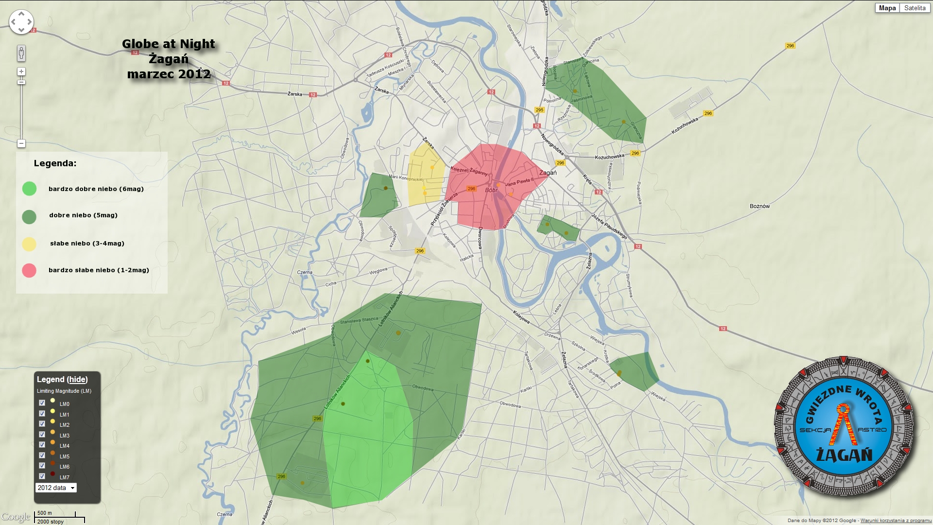 Mapa Żagania projekt Globe at Night marzec 2012r.Karol swoim komputerowym kunsztem opracował roboczą wersję mapy LP Żagania. Z niej powstała mapa końcowa. To wynik pracy całego zespołu biorącego udział w projekcie od zbierania danych pomiarowych, przez składanie raportów po ich ostateczne opracowanie. Te działania mają znacznie szersze znaczenie niż zdaje się to na pierwszy rzut oka. Tego dnia i w niedzielę obchodzimy dni ziemi. 40 miast z Polski i wiele na świecie, wyłącza na godzinę oświetlenie. W dużej części symbolicznie. To rodzaj manifestacji, że rozumiemy iż problem istnieje. Ale czy naprawdę jesteśmy wstanie zrobić coś więcej niż tylko taką manifestację? To proste. Jak w wierszyku z dzieciństwa o pstryczku elektryczku: „Pstryk i światło ….”.
