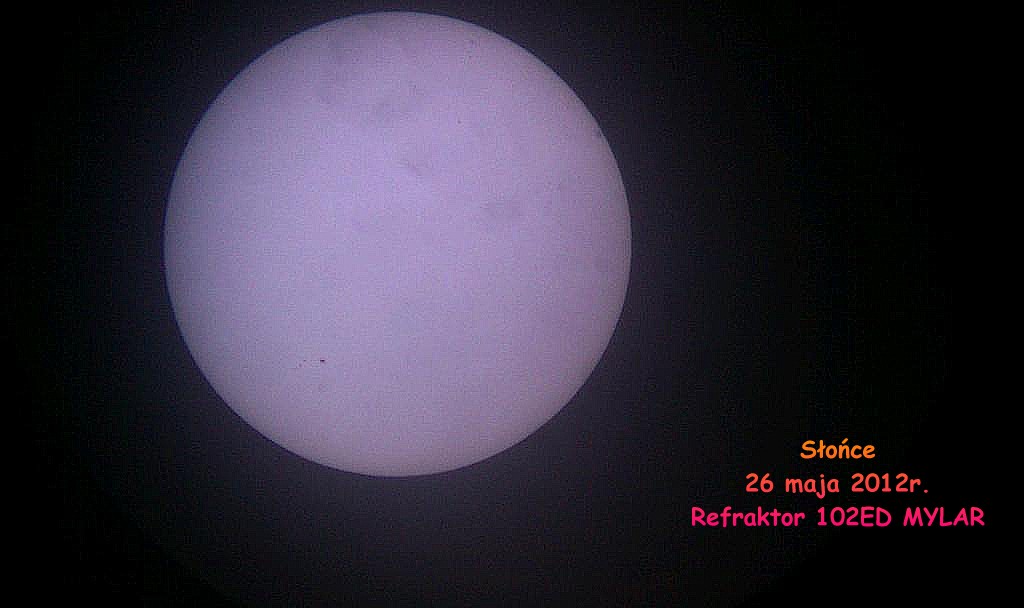 Słońce prezentowane na zakończeniu roku Szkoły Talentów. Autor: Rafał MiłodrowskiKażda z sekcji przygotowało prezentację swojej działalności. My przygotowaliśmy pokaz Słońca. Zawsze jest to trochę ryzykowne, bo pogoda jest kapryśna szczególnie w takich sytuacjach. Udało się jednak i pokazaliśmy przygotowanym refraktorem plamy na Słońcu. Obecne maksimum słoneczne jest dużym zaskoczeniem dla wszystkich i zaskakuje różnorodnością plam. Raz są raz ich nie ma, raz jest ich wiele drugim razem jak na lekarstwo.