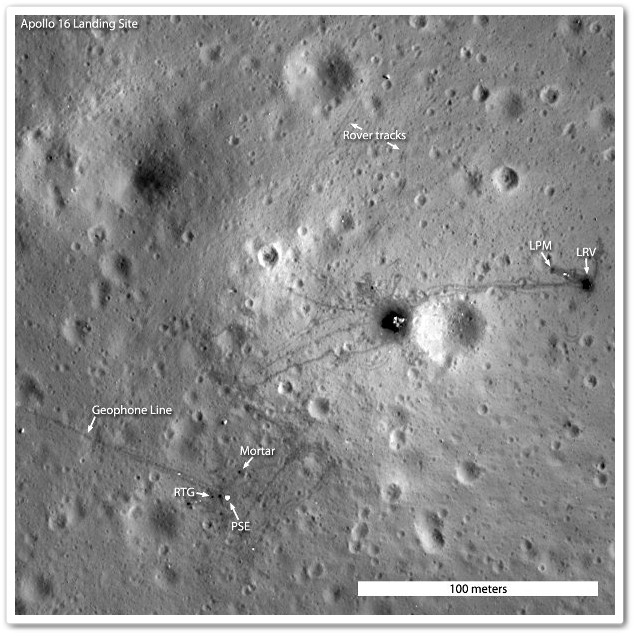 Obszar lądowiska misji Apollo 16 / Credits - NASA/GSFC/Arizona State UniversityZawsze gdy wraca się do tematu Misji Apollo pojawiają się komentarze w stylu Koncepcji Spiskowych, że podobno nas tam nigdy nie było a całość to jedna wielka mistyfikacja. Na przekór wszystkiemu kolejne misje w tym LRO pokazują nam co pozostało po człowieku na Srebrnym Globie, a tylko od nas samych będzie zależało, jak ocenimy ten niebywały wysiłek człowieka by stanąć na bezkresach tego ciała niebieskiego. A kiedy patrzymy na ile nas stać dzisiaj, dostrzegamy, że była to niezwykła przygoda ludzkości. Tak niezwykła, że trudno w nią dzisiaj komukolwiek uwierzyć. chyba nawet samym uczestnikom.