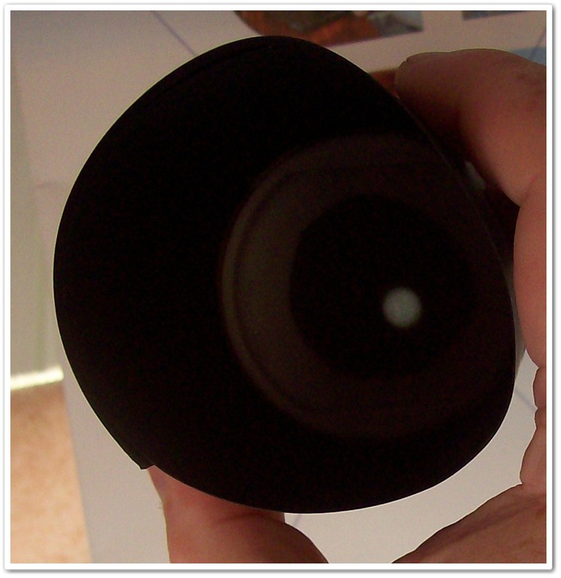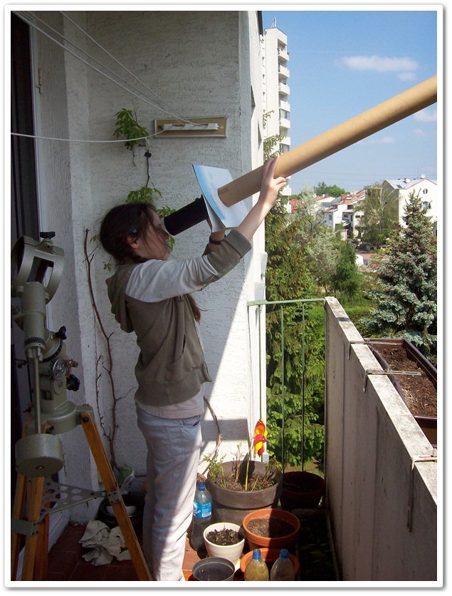 Widok Słońca przez Kamerę Obscura - zdjęcie z cytowanego opracowania Lecha Mankiewicza i Pawła RudawegoCzęsto na początku swojej drogi miłośniczego badania kosmosu adept zadaje sobie pytanie o teleskop astronomiczny. I w odpowiedzi otrzymuje wysokie ceny jakie przyjdzie mu za swoja pasję zapłacić. Czy naprawdę nie ma żadnej taniej alternatywy? W zasadzie jest, tylko trzeba się nieco rozejrzeć dokoła. Bo najczęściej nie za bardzo wiemy do czego on nam jest potrzebny i co nim chcielibyśmy badać. Aby sobie taką wiedzę wypracować warto zacząć od najprostszych rozwiązań, a takim jest …. Kamera Obscura, która postawiliśmy przy okazji tranzytu Wenus zbudować i wypróbować na obserwacjach Słońca.