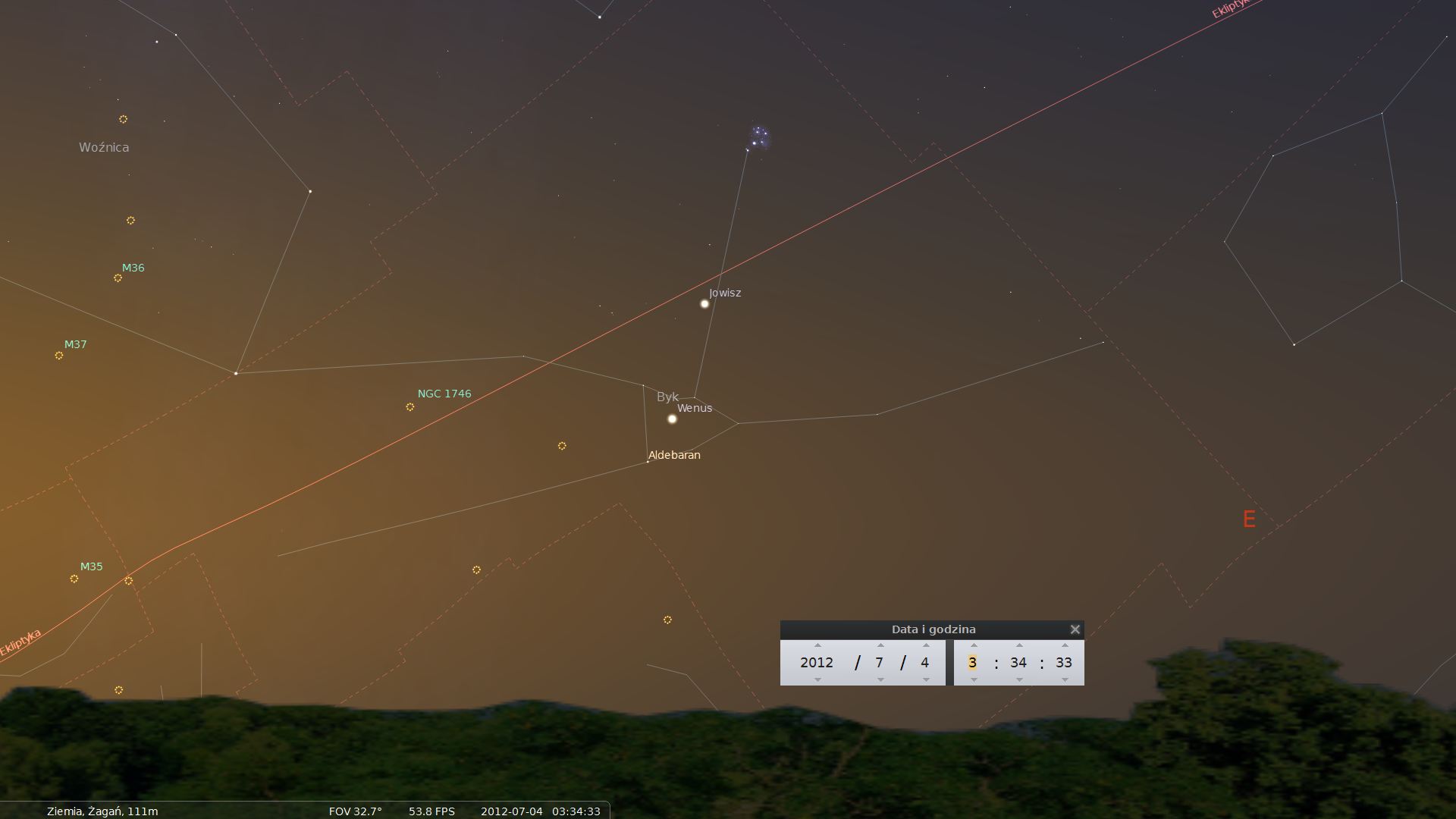 Jowisza na porannym niebie. Obie planety, godzinę przed wschodem Słońca, dojrzymy około 10 stopni nad północno-wschodnim horyzontem. Nie dość, że same będą blisko siebie (minimalny dystans to 4 stopnie), to Wenus przejdzie przez gromadę otwartą gwiazd o nazwie Hiady, a 9 lipca zbliży się na niespełna stopień do