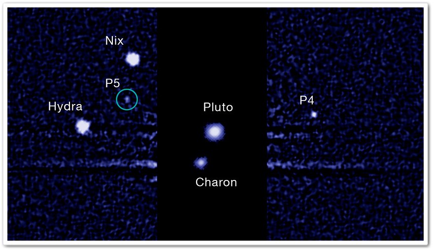 Największy księżyc Plutona, Charon, został odkryty w 1978 roku. Obserwacje Hubble'a w 2006 roku odkryły dwa dodatkowe małe księżyce Nyks i Hydra. W 2011 roku inny księżyc, znany jako P4, został znaleziony w danych Hubble'a.