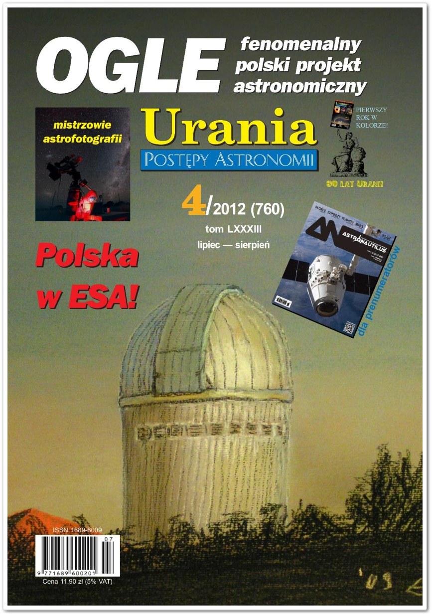Okładka numeru 4 Uranii PAZ Astronautiliusem tym razem dostajemy czwarty numer naszej Uranii Postępów Astronomii. Będzie można utonąć w czytelni na kilka chwil z takim zapasem. Widać warto prenumerować pismo za takie dodatki jakich nikt nie uświadczy gdzie indziej. Na początek warto się zatrzymać na