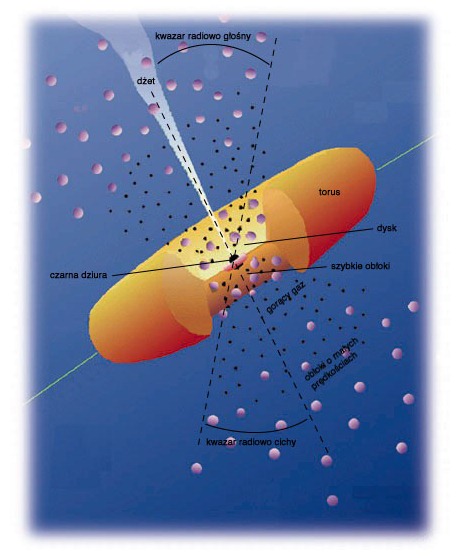 Model aktywnego jądra (AGN). W centrum znajduje się czarna dziura, wokół której wiruje dysk akrecyjny przechodzący w dalszych obszarach w gruby torus. Wokół znajdują się obłoki gazu, w ktorych powstają szerokie i wąskie linie emisyjne. Niektóre z AGN-ów dodatkowo produkują dżety -długie, wąskie strugi materii płynącej z prędkością bliską prędkości światła. Zaznaczono kierunki do obserwatorów, którzy ujrzą AGN pod postacią kwazara. Gdy AGN wytwarza dżet - kwazar będzie radiowo głośny (górna połowa schematu). Żródło: WiŻWe wtorek 4 września w Centrum Astronomicznym PAN w Warszawie, rozpoczyna się konferencja naukowa poświęcona niestabilnościom w dyskach akrecyjnych - informują strony internetowe Centrum.