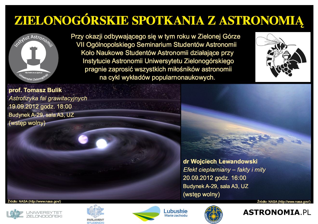 Dawniej astronomowie przemierzali całą Europę w poszukiwaniu swojego miejsca. Dziś zapraszamy Was do odwiedzenia Zielonej Góry w ramach VII Ogólnopolskiego Seminarium Studentów Astronomii organizowanego przez Koło Naukowe Studentów Astronomii UZ, które odbędzie się w dniach 20-23 września 2012 r. W trakcie trwania seminarium studenci i doktoranci astronomii z całej Polski będą mogli zaprezentować wyniki swojej pracy, wymienić się doświadczeniami oraz przedstawić swoje zainteresowania.