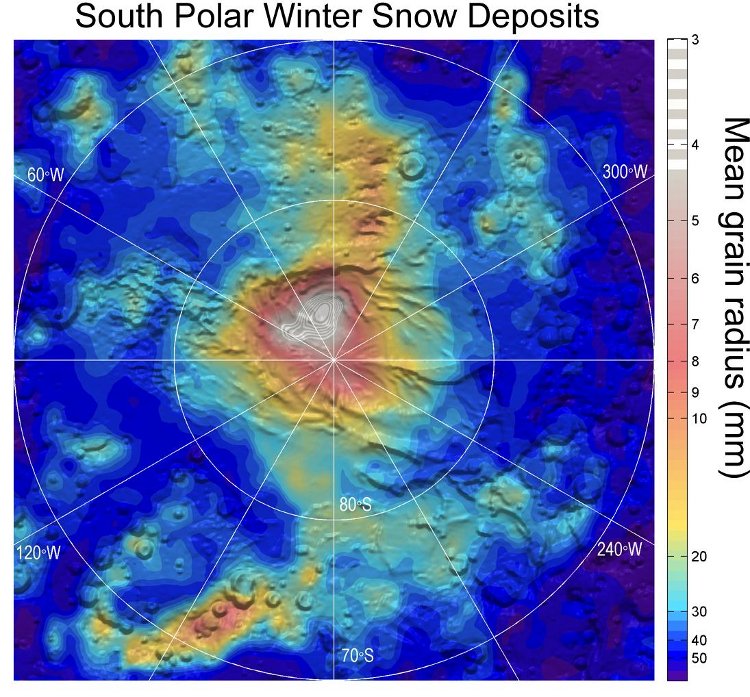 Na południowym biegunie Marsa zalega pokrywa lodowa, jest to jedyne takie miejsce na całej planecie, gdzie zamrożony dwutlenek węgla utrzymuje się przez cały rok. Jak dwutlenek węgla z atmosfery Marsa zostaje związany pozostaje pytaniem. Niejasne jest, czy występuje w postaci śniegu, czy przez zamrożenie się na poziomie gruntu, jak mróz. Wyniki te pokazują, że opady śniegu są szczególnie intensywne na szczycie pokryw lodowych.