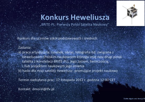 Konkurs Heweliusza - BRITE-PL: Pierwszy Polski Satelita NaukowyCentrum Badań Kosmicznych wraz z Centrum Astronomicznym zapraszają uczniów szkół podstawowych i średnich do udziału w "Konkursie Heweliusza". Konkurs zaczyna się