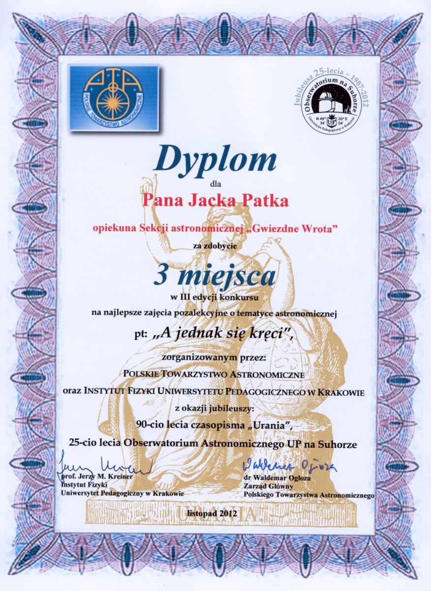 Dyplom za zajęcie trzeciego miejsca w konkursie krajowym na zajęcia popularyzujące astronomię