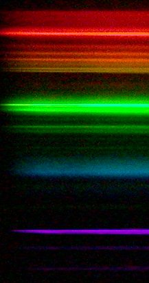 Widmo emisyjne żarówki energooszczędnejDo pracy potrzebujemy wydrukowany na kartce szkielet przyrządu, który naklejamy na czarny karton, a następnie wycinamy. na dole w linkach znajdziecie cały artykuł jak wykonać spektroskop. Tu wspomnimy tylko tyle, że do jego budowy wykorzystujemy płytę CD lub DVD. Która umieszczamy zgodnie z instrukcją. Po skierowaniu przyrządu na źródło światła (żarówka, słońce, świetlówka) w wizjerze zobaczymy wyraźny barwny pas lub szereg kolorowych pasków. To właśnie rozszczepione na barwy składowe światło. Rozszczepienie nastąpiło na szczelinach utworzonych przez „linie” na płycie DVD lub CD. Przyrząd jest banalny w wykonaniu i działa od razu. Teraz można badań różne źródła – np. lampy uliczne. W przypadku DVD uzyskamy większa rozdzielczość ale obraz będzie słabszy.