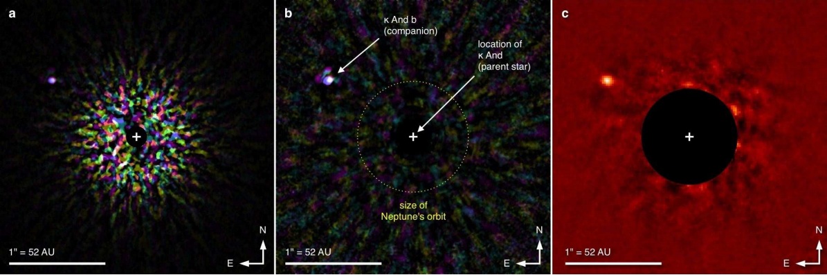8,3 metrowego obserwatorium Subaru/HiCIAO. Masę kappa And b oszacowano na około 13 mas Jowisza. Ta egzoplaneta krąży dookoła swej gwiazdy macierzystej, widocznej gołym okiem kappa Andromedae, w odległości około 56 jednostek astronomicznych – prawie 2x dalej niż Neptun w naszym Układzie Słonecznym.