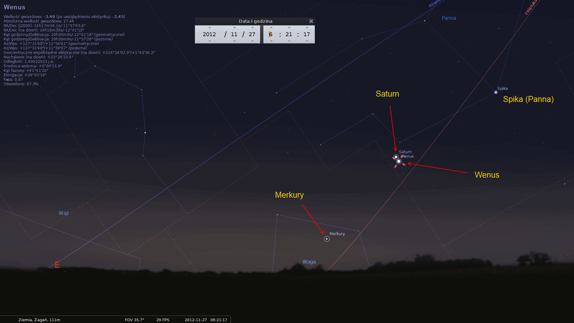 "Osoby, które będą miały bardzo dobry widok na południowo-wschodni horyzont mogą pokusić się też o odnalezienie Merkurego. Będzie on świecił kilka stopni na wschód od Wenus oraz Saturna i będzie go widać niespełna 5 stopni nad horyzontem" - zachęcał dr Olech.