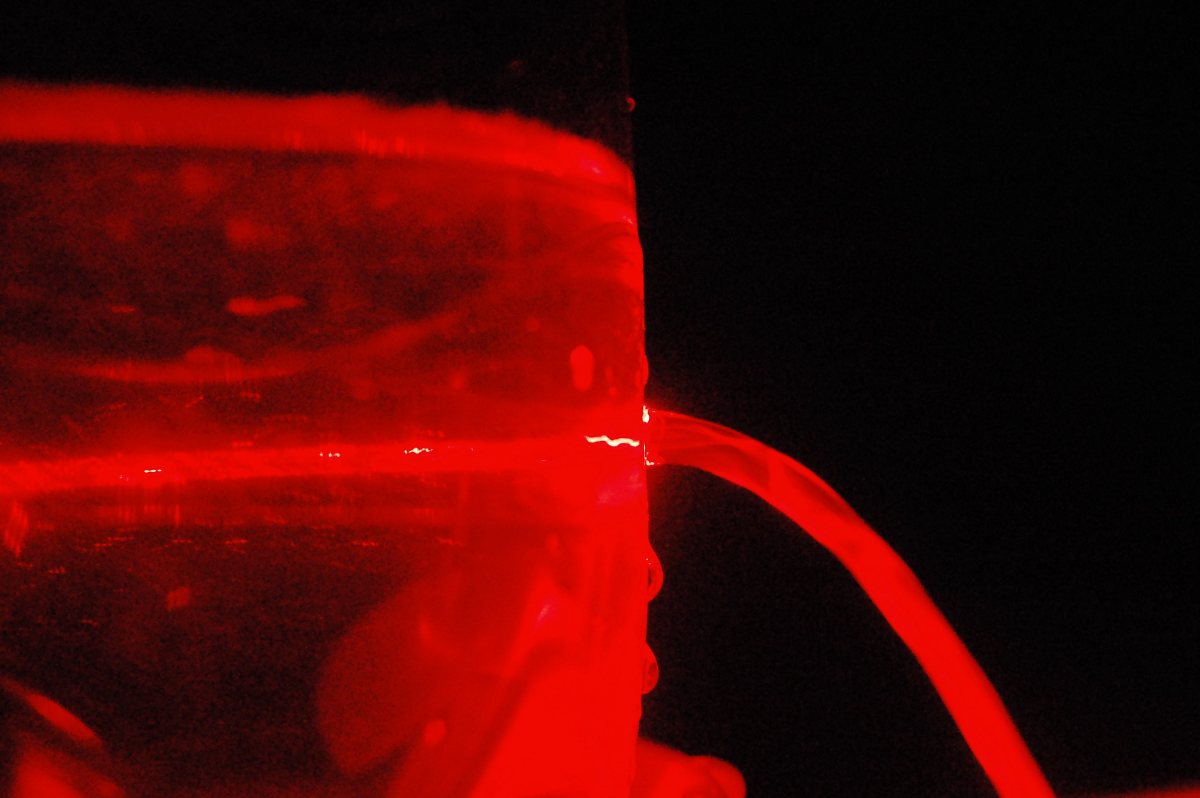 Promień laserowego światła wchodzi przez otwór w butelce po przeciwległej stronie zbiornika w wypływający strumień wody. Woda ciągłym strumieniem wypływa do stojącego niżej pojemnika. Ważne jest by strumień był ciągły i nie przechodził w strukturę kropli. Tym razem na dnie zbiornika widzimy rozświetlającą dno poświatę. Jak to możliwe by zakrzywiony strumień wody zmieniał kierunek promienia światła lasera? Na zdjęciu widzimy, że światło odbija się od ścianek strumienia i stopniowo przez całą jego długość, zmienia kierunek wzdłuż zakrzywionej strugi wody. To na granicy ośrodków woda-powietrze następuje całkowite wewnętrzne odbicie. światło praktycznie nie przechodzi na zewnątrz tego wodnego światłowodu.