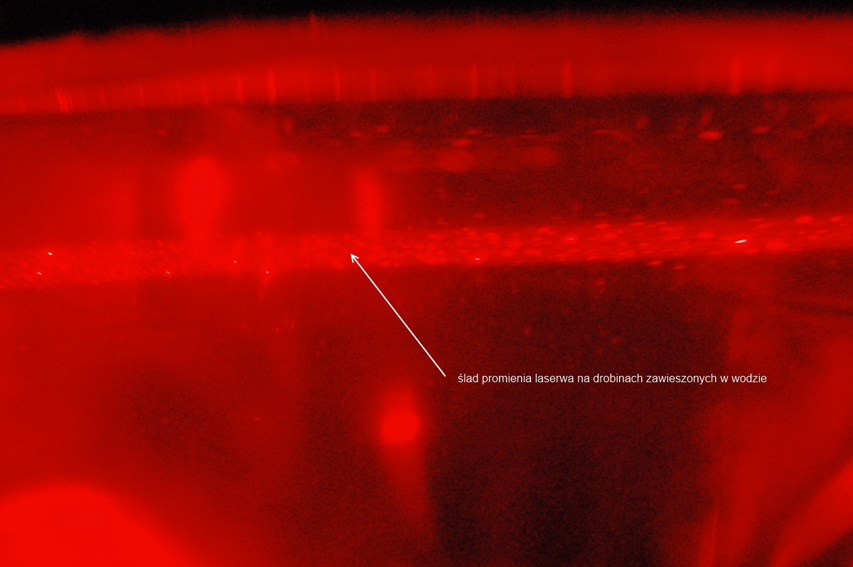Woda w roli światłowodu dla promieniowania laserowego. Szczególnie interesujące jest ślad promienia lasera w strumieniu wody, co by świadczyło o strukturze wypływu wody z naszego zbiornikaDoświadczenie było dość proste. W zbiorniku z butelki pet zrobiliśmy otwór przez który ma wypływać woda. Do ścianki butelki przystawiamy zwykły wskaźnik laserowy, a jego światło kierujemy przez butelkę na wylot strumienia wody z butelki. Efekt jaki uzyskujemy daje możliwość zaobserwowania wielu ciekawych właściwości światła.