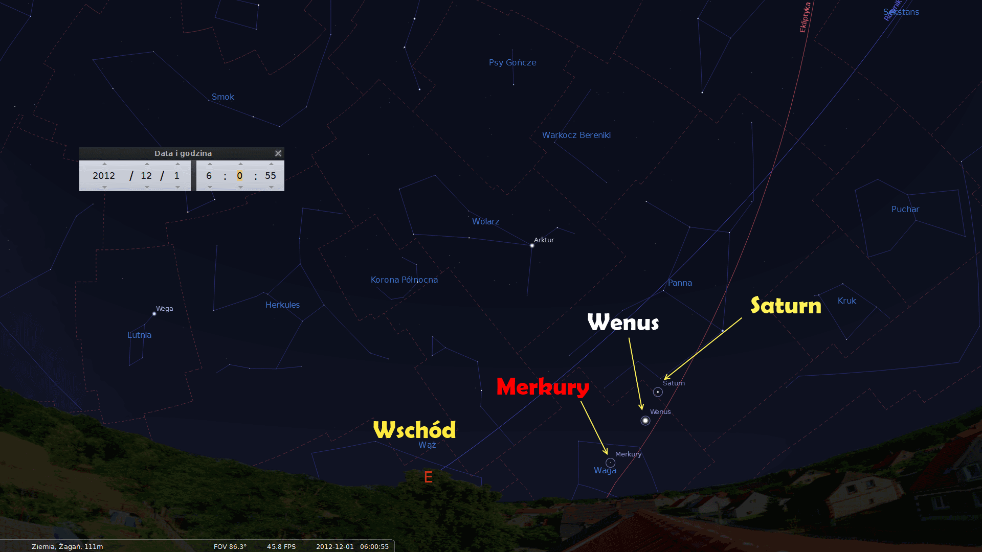 Według niego bardzo dobrym okresem do obserwacji Merkurego, w tym roku, jest właśnie przełom listopada i grudnia. "Godzinę przed wschodem Słońca, a więc około godziny 6.30 rano, Merkurego dojrzymy niespełna 10 stopni nad południowo-wschodnim horyzontem. Trochę wyżej od niego i kilka stopni na zachód świecą dwie inne jasne planety: Saturn i Wenus. Wenus jest znacznie jaśniejsza od Merkurego, ale to Merkury jest jaśniejszy od Saturna" - powiedział naukowiec.