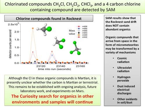 Pomiary przy „Rock Nest” wykazały także obecność związków organicznych. Wykryto związki takie jak CH3Cl, CH2Cl2 i CHCl3 (oraz kila innych), czyli chlorowe pochodne najprostszych związków organicznych. Czwarta grafika w galerii tego artykułu prezentuje slajd z konferencji prasowej, która dotyczy zarejestrowanych związków organicznych. W tej chwili nie jest jeszcze pewne, czy te związki nie są zanieczyszczeniem - tę okoliczność trzeba sprawdzić i wyeliminować zanim zostaną wysunięte dalsze wnioski. Tu warto zauważyć, że naukowcy biorący udział w misji MSL są bardzo ostrożni i wolą wpierw wyeliminować wszystkie potencjalne źródła zanieczyszczeń zanim dokonają interpretacji wyników.