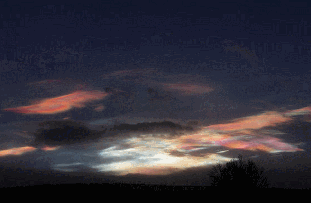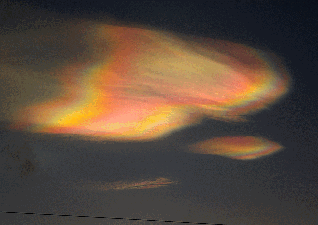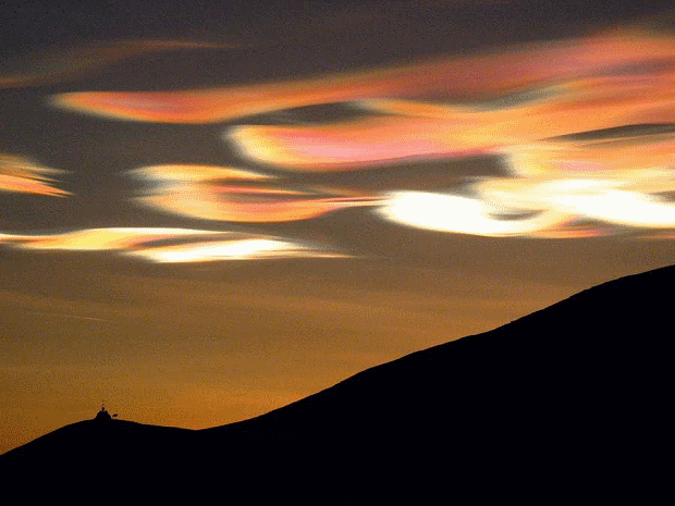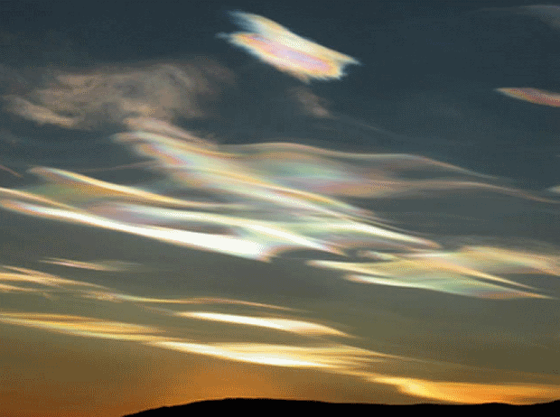 Fot. Nigel Feilden, Szkocja.W ich składzie wyróżnić można także kwas siarkowy i azotowy. Dzięki temu obłoki te są zdolne odbijać promienie słoneczne w taki sposób, że wyglądają jakby świeciły kolorami tęczy o świcie i zmroku.