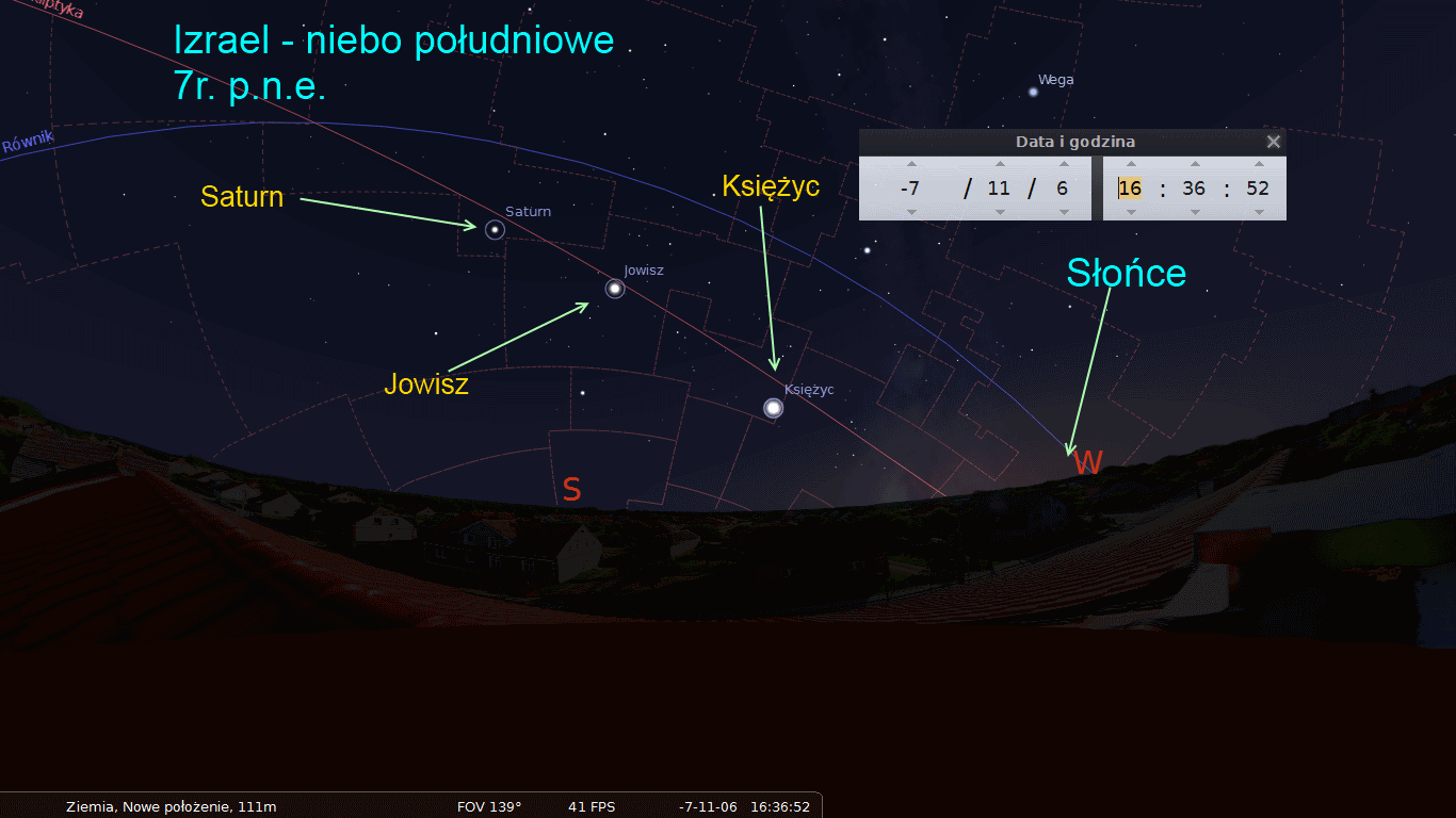 Widok nieba południowo-zachodniego w Izraelu w 7 roku przed naszą erą"Magowie którzy wędrowali po to, aby pokłonić się Jezusowi, byli niewątpliwie dobrymi obserwatorami nieba, zajmowali się tym. Niebo – takie jak wyglądało na co dzień, było im znane, musiał to więc być obiekt, który nagle się na nim pojawił. Najbardziej prawdopodobnym w tej kategorii zjawisk byłby wybuch supernowej. Jeżeli miałoby to być zjawisko bardzo jasne, widoczne, musiałaby to być supernowa galaktyczna, podobna do tej, której wybuch obserwował Johannes Kepler w XVII w. w gwiazdozbiorze Kasjopei. Mogła być tak jasna, że również widoczna w ciągu dnia" - powiedziała prof. Bednarek.