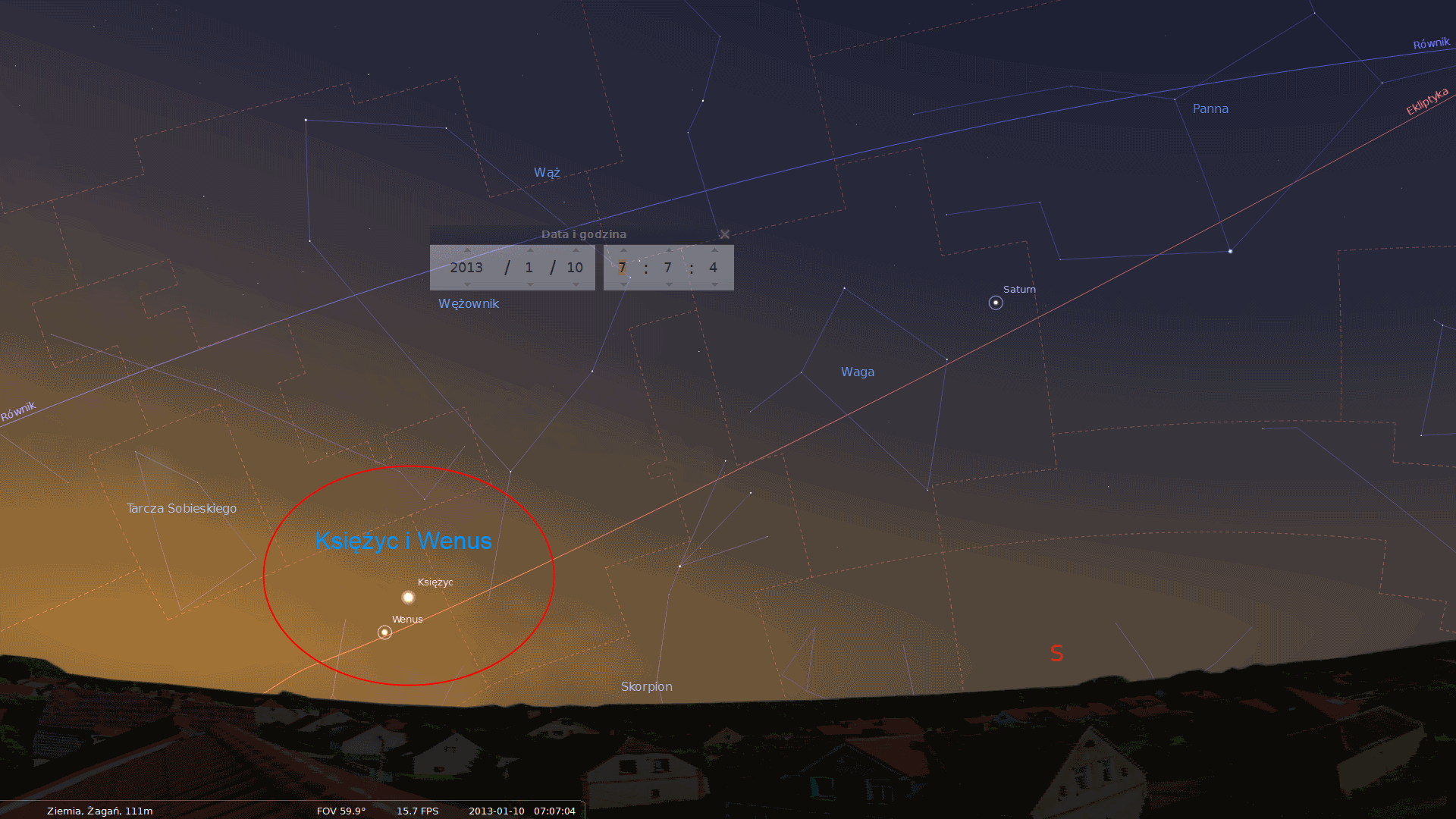 Na obserwacje najlepiej wyjść 10 stycznia tuż przed godziną 7 rano czyli niespełna godzinę przed wschodem Słońca (w Warszawie Słońce wschodzi o 7:41). Wenus i Księżyc będą świecić niziutko, bo tylko niecałe 5 stopni nad południowo-wschodnim horyzontem.