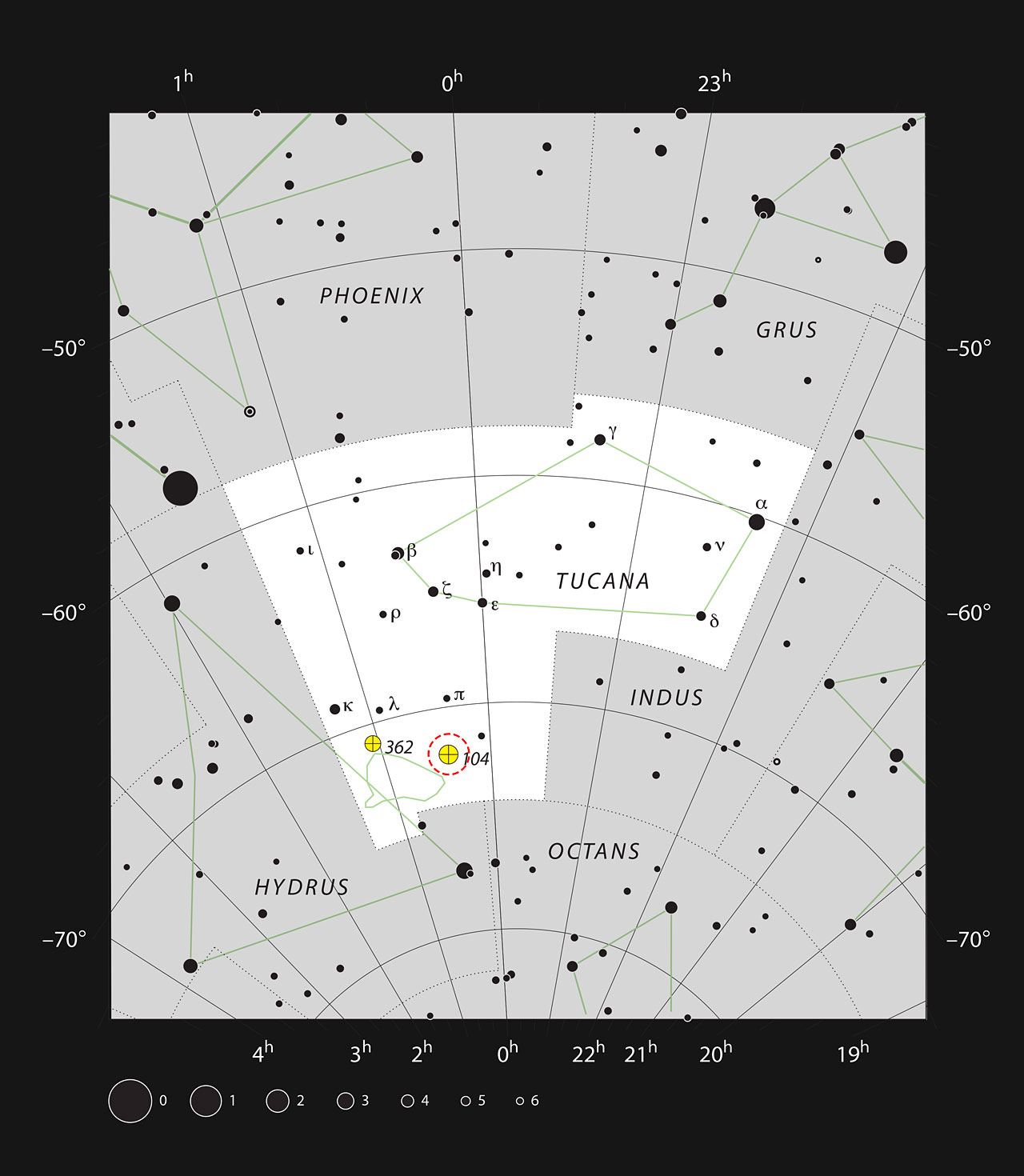 Widoczna w południowym gwiazdozbiorze Tukana, 47 Tucanae okrąża naszą Drogę Mleczną. Ze średnicą 120 lat świetlnych jest tak duża, że pomimo odległości, ma na niebie rozmiar prawie tak duży jak tarcza Księżyca. Zawierając miliony gwiazd jest jedną z najjaśniejszych i najmasywniejszych znanych gromad kulistych i widać ją gołym okiem [1]. Pośród wirującej masy gwiazd, w sercu gromady, znajdują się intrygujące systemy, w tym źródła promieniowania X, gwiazdy zmienne, „gwiezdne wampiry”, niespodziewanie jasne „zwykłe” gwiazdy znane jako błękitni maruderzy (eso1243) oraz niewielkie obiekty nazywane pulsarami milisekundowymi, małe, martwe gwiazdy, które obracają się niesamowicie szybko [2].
