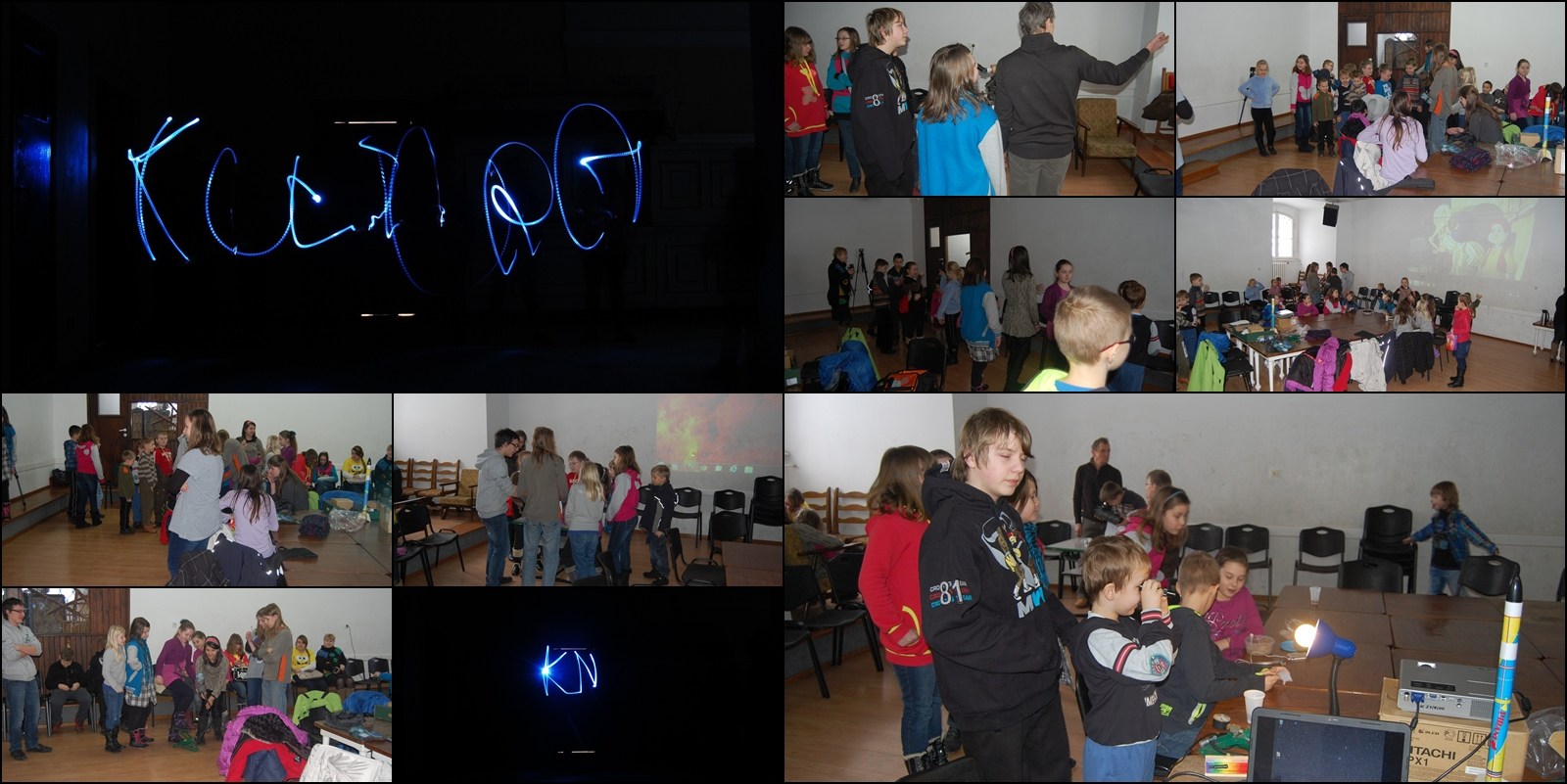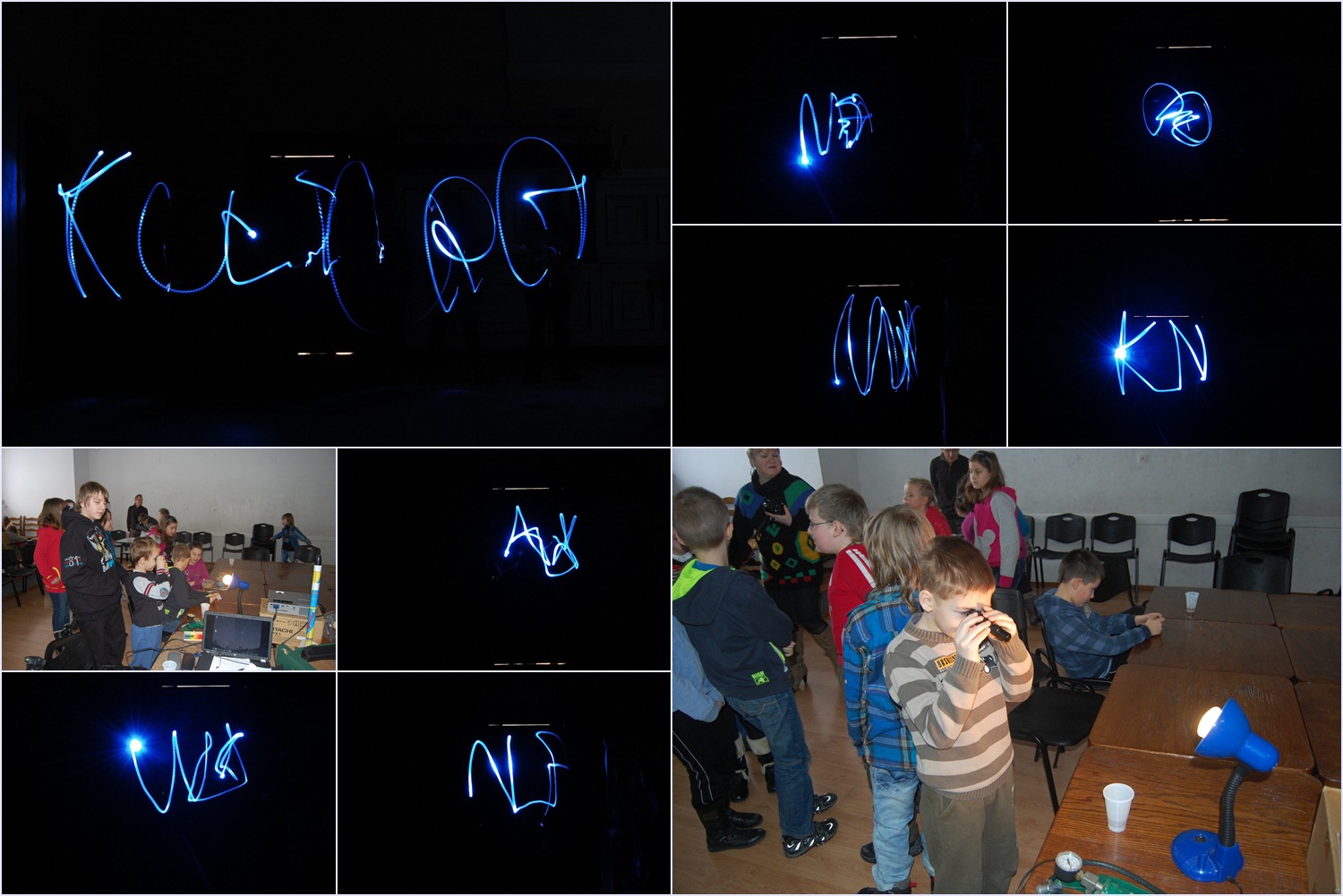 Na koniec postanowiliśmy pokazać jak astronom czyta na odległość światło gwiazdy. Każdy uczestnik stawał na końcu korytarza i pisał swoje inicjały latarką, podczas gdy aparat fotograficzny obserwatora notował pisane w powietrzu litery przez 10 sekund. Mniej obeznanym z pisaniem pomagał Karol. Tym sposobem powstał pokaźny bank danych o występujących w ciemnościach naszych gwiazdach.