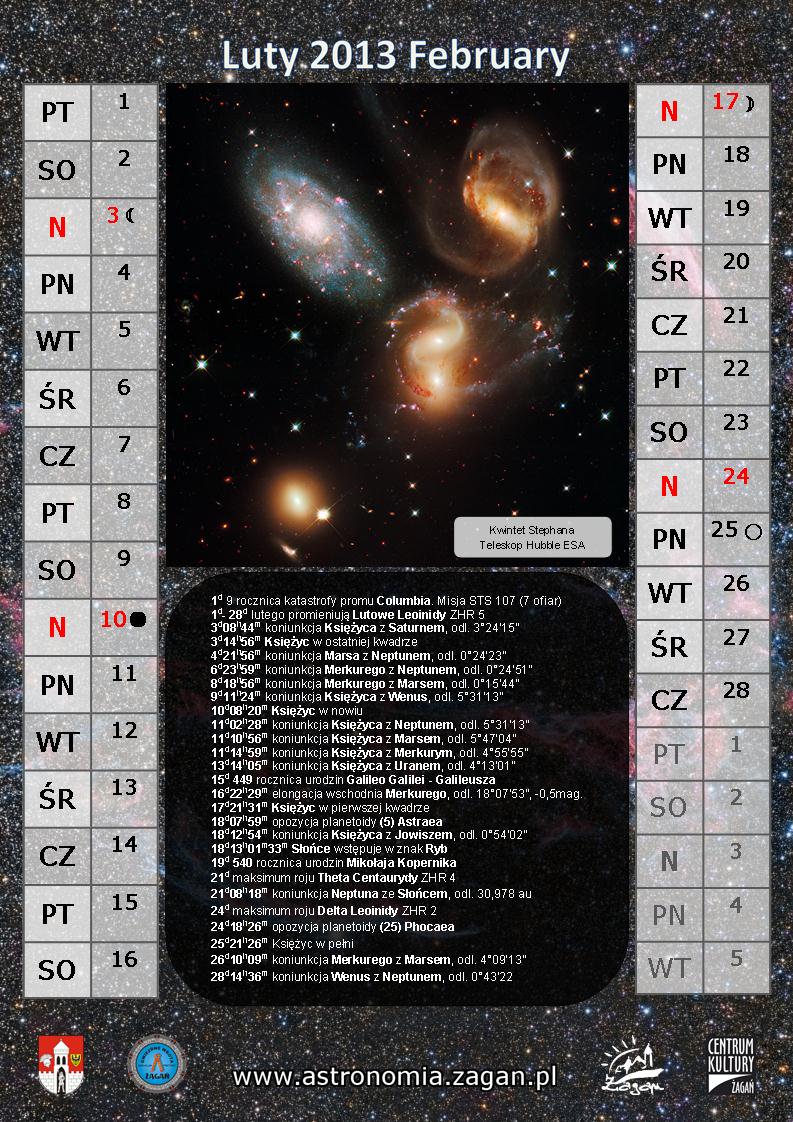 Strona Astrokalendarza 2013 na lutyLuty to dobry czas na wieczorne obserwacje Merkurego. Najbliższą Słońcu planetę można zacząć wypatrywać już od około 10 lutego, lecz najlepsze warunki do obserwacji wystąpią około 18 lutego. Wtedy, niespełna godzinę po zachodzie Słońca, Merkury świeci kilka stopni nad zachodnim horyzontem.