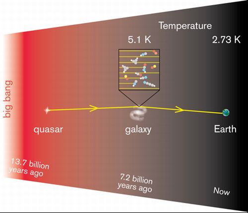 Zgodnie z teorią Wielkiego Wybuchu temperatura przestrzeni kosmicznej spada wraz z ekspansją Wszechświata. Wyniki zgodne z tą teorią potwierdzają, iż miliardy lat temu Wszechświat był cieplejszy o parę stopni.