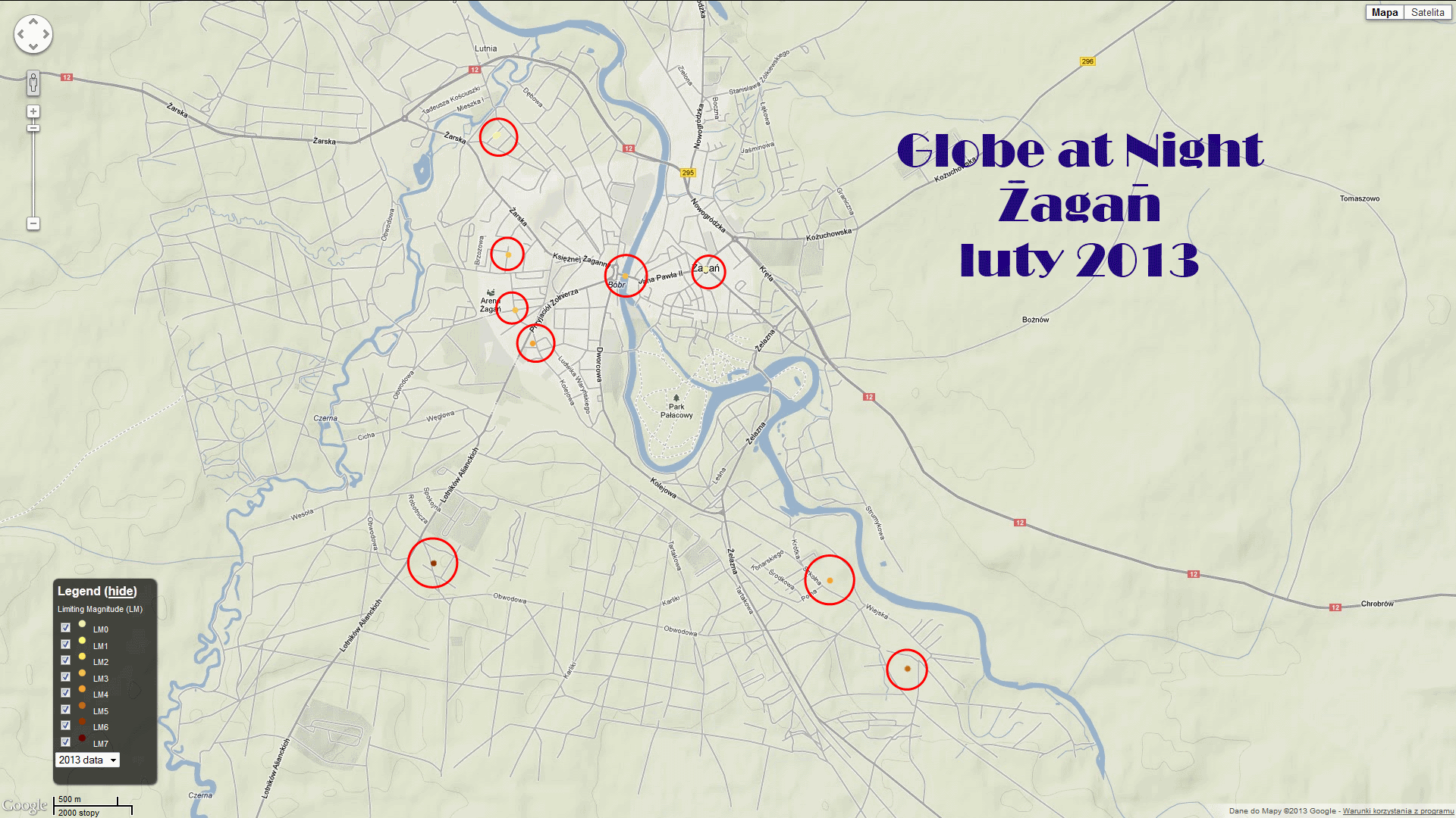 LP w różnych miejscach miasta i okolicy. Przy okazji przygotujemy akcję o poprawę stanu oświetlenia w mieście. Trzeba nam tylko przeczekać referendum, bo ludzie żyją teraz innymi sensacjami. Jak pokazuje mapa projektu w okolicy Legnicy działa prężna grupa badaczy nieba. Liczba pomiarów jest tam imponująca, ale nie ma co się dziwić, Legnica to bardzo jasne miasto. Mamy jednak nadzieję, że w dobie kryzysu coraz więcej miejscowości i miast będzie się ograniczało w wyrzucaniu pieniędzy na niepotrzebne iluminacje czy złe oświetlenia. To dobra okazja by coś w tej materii osiągnąć.