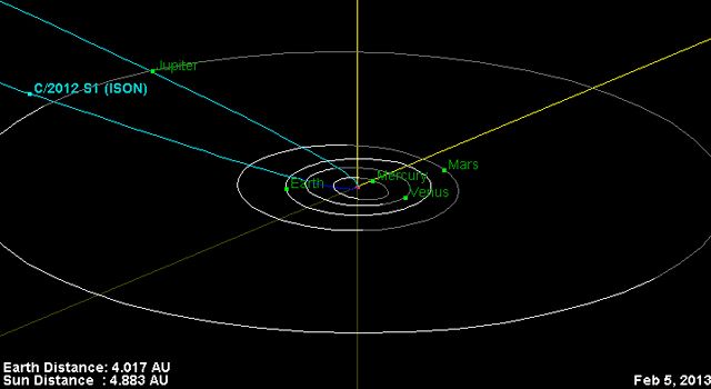 Orbita komety C/2012 S1 (ISON)Trwają obserwacje zmierzającej ku centrum Układu Słonecznego komety C/2012 S1 (ISON), która pod koniec roku może stać się dużą atrakcją na nocnym i być może także dziennym niebie. W kampanię obserwacyjną zaangażowana została także słynna sonda Deep Impact. Amerykańska sonda Deep Impact, która ma na koncie m.in. bliskie przeloty w pobliżu komet Tempel 1 i Hartley 2 oraz obserwacje komety Garradd, zaangażowana została w obserwacje potencjalnej „komety stulecia”. W dniach 17 i 18 stycznia, z odległości ok. 790 mln km, przeprowadzona została 36-godzinna sesja zdjęciowa z wykorzystaniem instrumentu MRI (Medium-Resolution Imager).