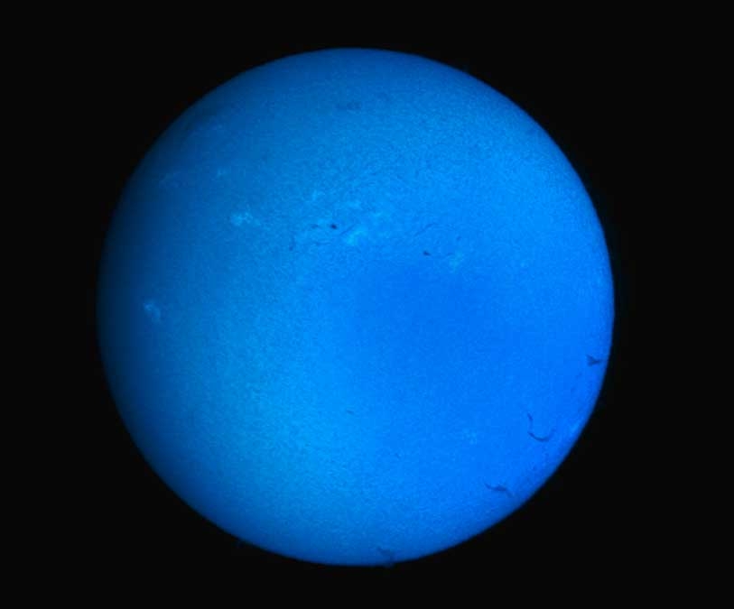 Zdjęcie Słońca w liniach wodoru-alfa wykonana w Zatomiu przez Mariusza RudzińskiegoZamieszczam tu jedno zdjęcie tarczy jakie zrobiłem przykładając aparat do okularu. Zmieniłem kolor z oryginalnego czerwonego na niebieski aby uwydatnić szczegóły.