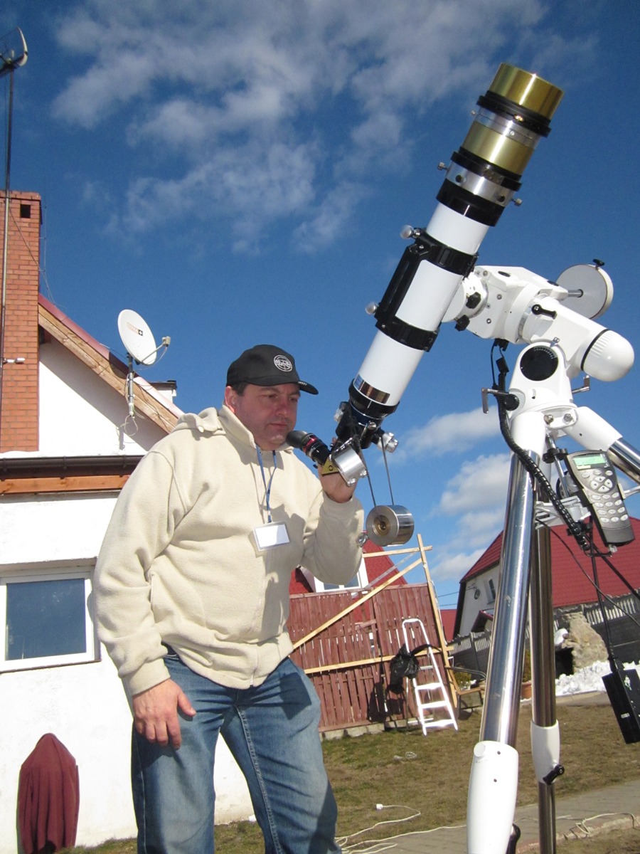 Mariusz Rudziński przy teleskopie słonecznymWłaśnie zakończył się zlot miłośników astronomii który to już po raz szósty odbył się w Zatomiu. Miejscowości w samym centrum Drawieńskiego Parku Narodowego ZD. W związku z tym ze miejscowość oddalona jest od większych miejscowości, nocne niebo jest tam ciemne jak nigdzie indziej (a na pewno najciemniejsze w całej zachodniej Polsce).